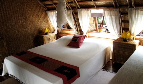 Song Xanh 5 (23m long x 4,5m wide, 2 bedrooms,1 living room that can be transformed into 1 more bedroom at night if needed) (16m2/each). The large bathroom is equipped with shower, washbasin, wc, and provide a full set of deluxe amenities such as slippers, cotton bathrobes, bathtowels, shampoo, soap, toothbrushes, comb, cotton tips, shower cap, and sanitary bags.
